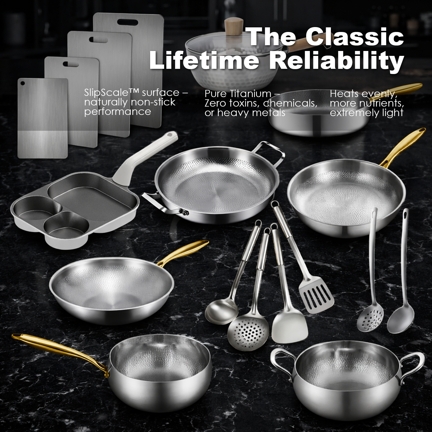 Expertly crafted from pure, food-safe titanium, offering a healthy and worry-free cooking experience free from harmful coatings or chemicals. Designed for strength and longevity, it resists corrosion, warping, and wear while delivering reliable performance for everyday and high-heat cooking alike.